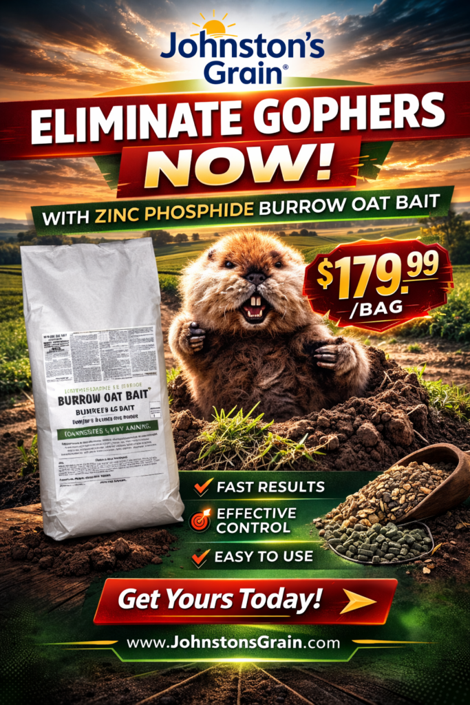 If you have field access, now is the time to scout and act before breeding begins and populations expand. We are currently offering 20 kg bags of zinc phosphide burrow oat bait for $179 per bag. For more information or to place an order, please reach out to your trusted broker at Johnstons Grain: 1.844.324.7778